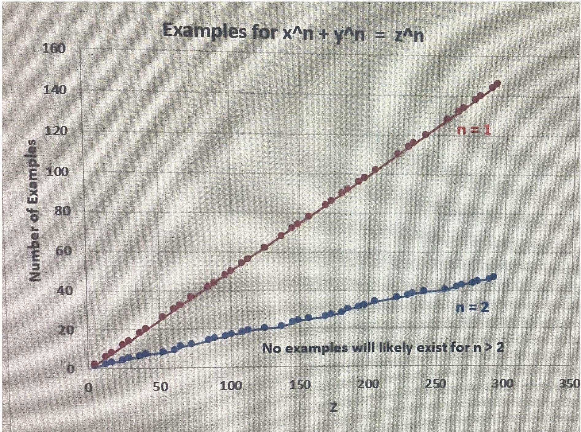 In the chart below, the upper line is for n = 1 and the lower line is for n = 2. If Fermat had made such a chart, simple inspection should have suggested to him that no examples would likely exist for n >2. (Such has actually been shown for a number of particular integers.) Interestingly, the ratio of the two like slopes is approximately 3:1