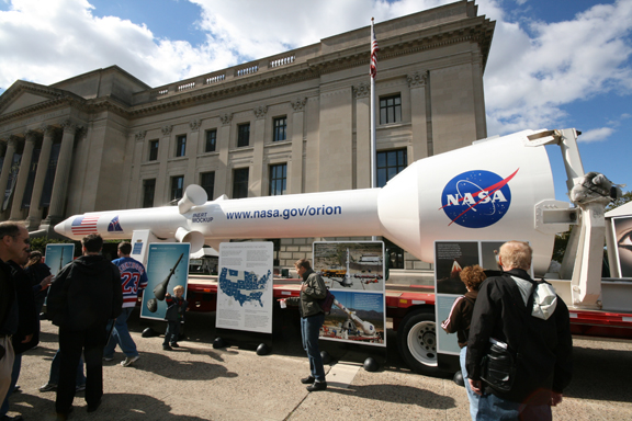 The impressive rocket display and information panels were popular with kids and adults passing by. The outdoor display was accompanied by an exhibition booth inside the museum atrium which was manned by engineers from Orion’s prime contractor Lockheed Martin and sub contractor ATK to explain Orion spacecraft operations.