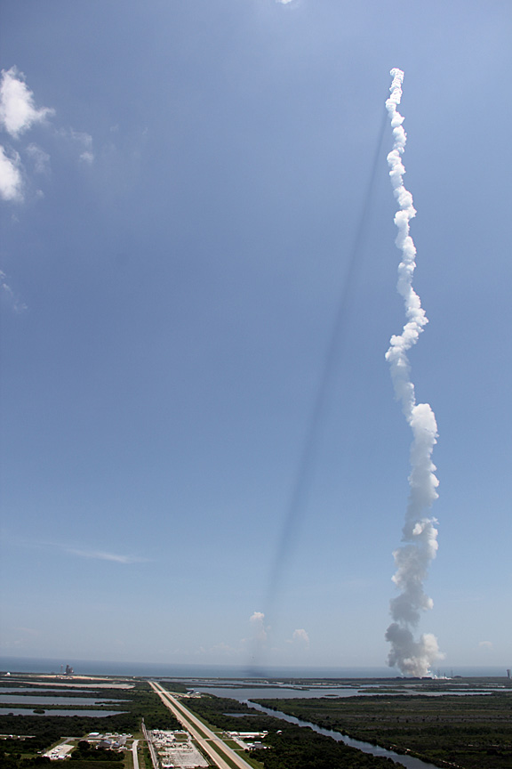 Juno casts a shadow back toward Earth and Space Shuttle Launch Pad 39A and the shuttle crawlerway (at left) seconds after liftoff from adjacent Pad 41 at Cape Canaveral, Florida. Credit: Ken Kremer
