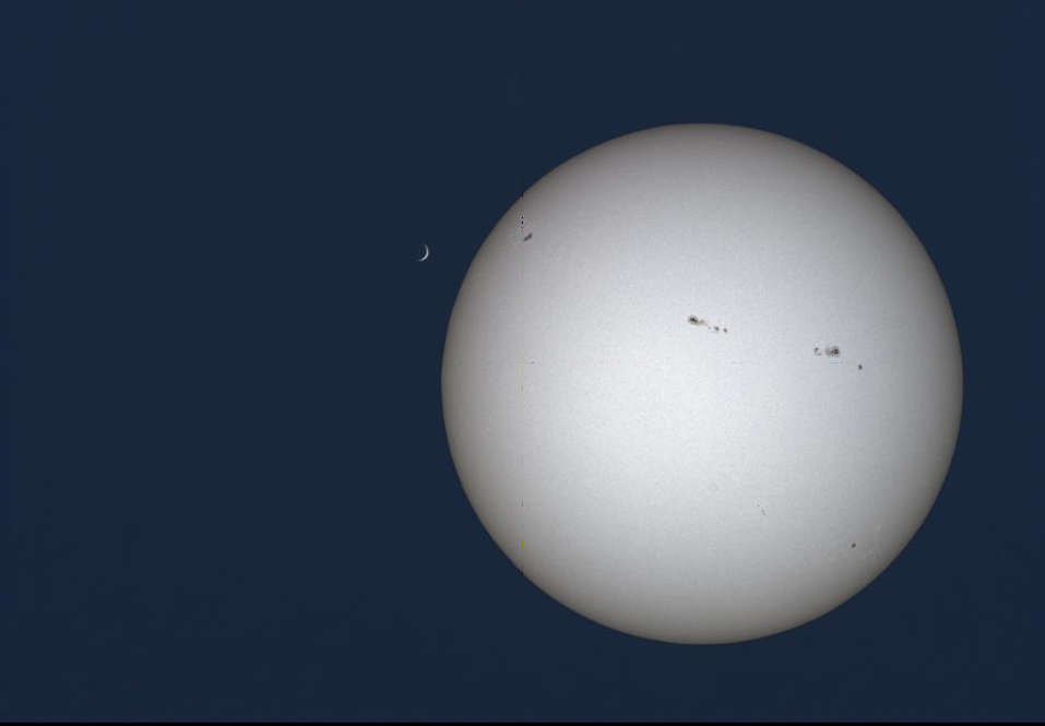 Bob Vanderbei took pictures of the Sun and Venus on the same day (May 19, just two weeks before the transit) using the same equipment (Canon DSLR on 3.5″ Questar) and combined them into this montage in which Venus is moved close to the Sun.