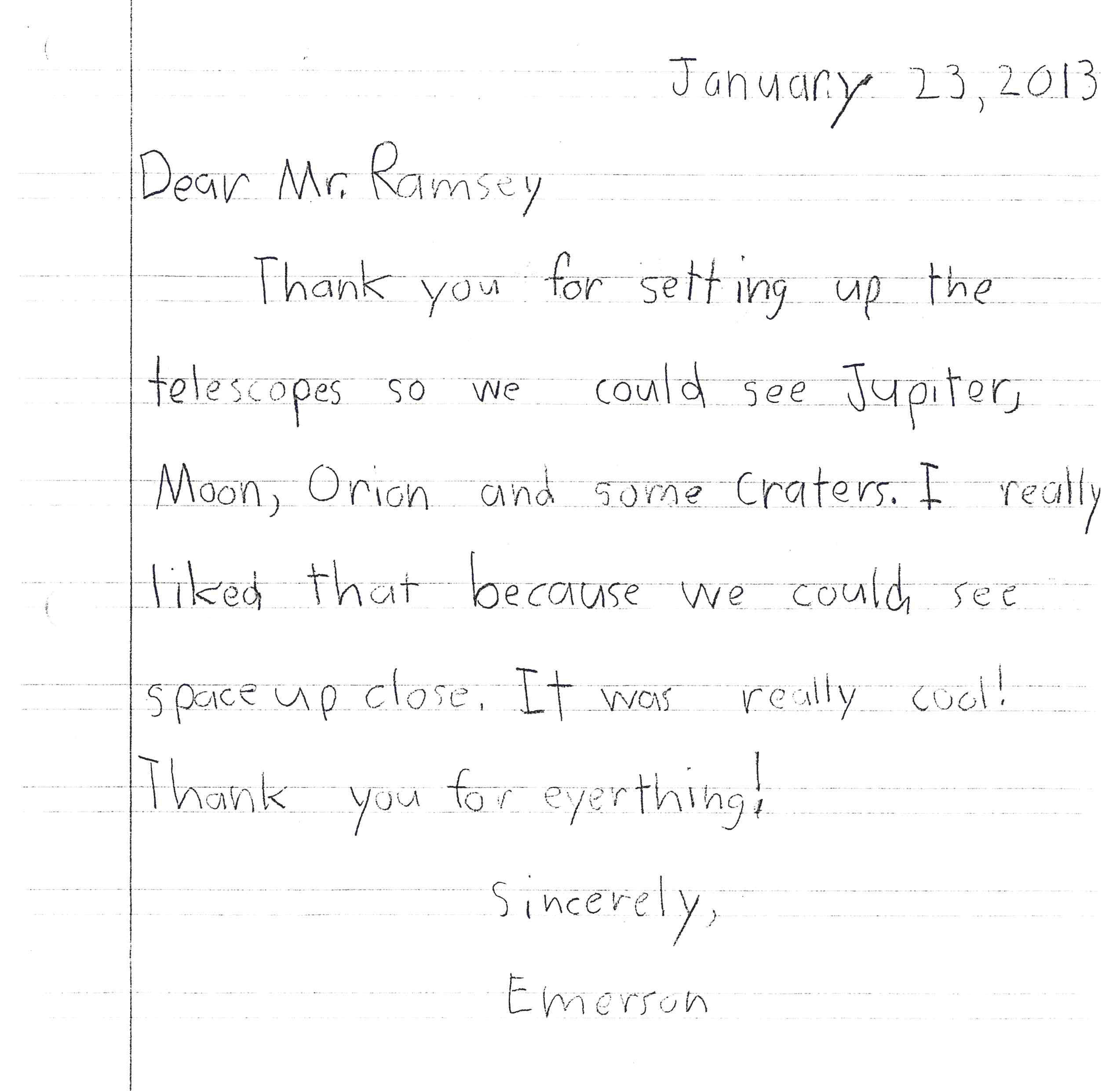 On January 22, 2103, Gene Ramsey, David and Jen Skitt, and I hosted one of the coldest star parties in recent memory at Hopewell Elementary School. The temperature was 17°F, but the children enjoyed “space up close.” Gene received several thank you letters from the students like the one above.