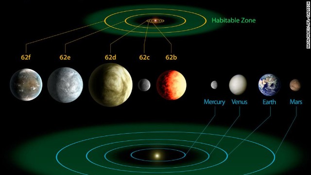 This diagram compares the planets of our own inner solar system to Kepler-62, a five-planet system about 1,200 light-years from Earth. Kepler-62e and Kepler-62f are thought capable of hosting life.
