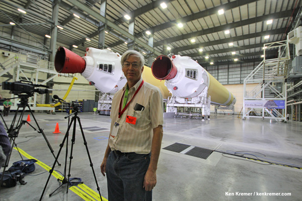 Two of the three first stage boosters comprising the mammoth Delta IV Heavy rocket that will propel Orion to high Earth orbit have arrived at Cape Canaveral Air Force Station, Florida, and were unveiled in mid March by top NASA managers at a media briefing I attended at the Cape.