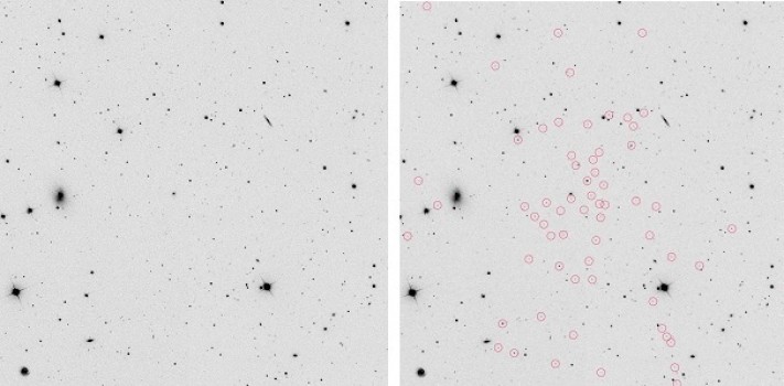 On the left, Segue 1 (note that you can’t see the galaxy); on the right, the stars that are part of Segue 1 are circled. Credit: Marla Geha Yale University