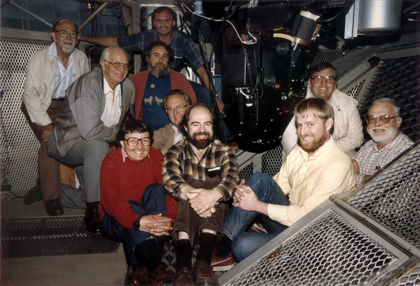 James Gunn (center), James Westphal (far right), and their team inside the Hale Telescope’s Cassegrain cage with Four-Shooter, the prototype for the Hubble Space Telescope WFPC camera, c. 1984. (Credit: J. Gunn)