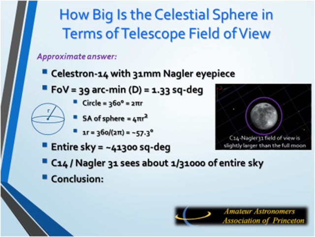 What fraction of the sky do we actually see in a telescope? At last month’s meeting we considered the size perspective of observing through the eyepiece of a telescope. To revisit that idea, here’s the slide (below) I showed giving the geometry and math. We concluded that the field of view using the equipment described is only a tiny fraction of the entire sky, about 1/31000 or ~0.0032% of the entire sky (considering the sky over a year). Yet the full moon seems so large! Of course, what this really means is that we have a lot of observing to do in the months ahead…