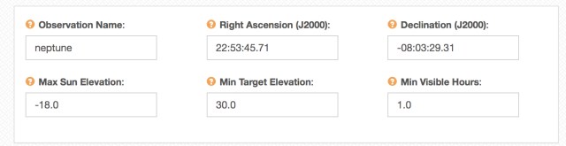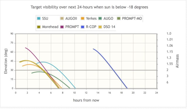 However, if there is no target visibility (nothing above the 30 deg elevation marker – or a complete lack of “colored” lines – then cancel your request, and choose another target. This will most likely happen with planets. Alternatively, you could change the minimum visible hours from “1.0” to, say, 0.5 and try to squeak in an observation.