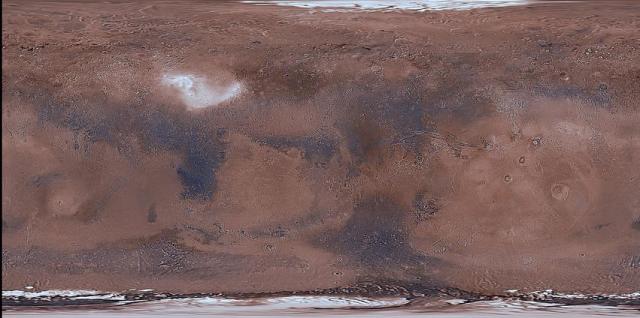 To make things even more interesting, here is a Viking Orbiter mosaic image of Mars in a Mercator projection, with 0 degrees longitude in the center and south up. Many of the same features are obvious here. Hellas has frost on it, which is a fairly common occurrence in this low-lying area. [Credit: NASA]
