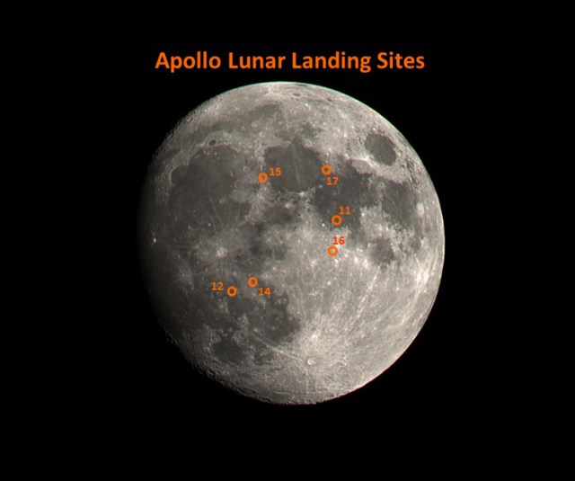 The Moon in All It’s Glory. Celebrating the achievements of the Apollo program will reach a crescendo this summer for the 50th anniversary of the Apollo 11 landing in July. With kudo’s to our May speaker, James Chen (author of How to Find the Apollo Landing Sites, published by Springer), I took the liberty of assembling a composite of all the lunar landing sites on an image of the nearly full moon I took a couple years ago with a small refractor telescope. One of many remarkable aspects of the landings is how close together they were in both time and space on the moon’s surface. Only a small fraction of the landscape was sampled by the 6 locations. All the landings were done in less than 3-1/2 years, a feat that seems impossible today.