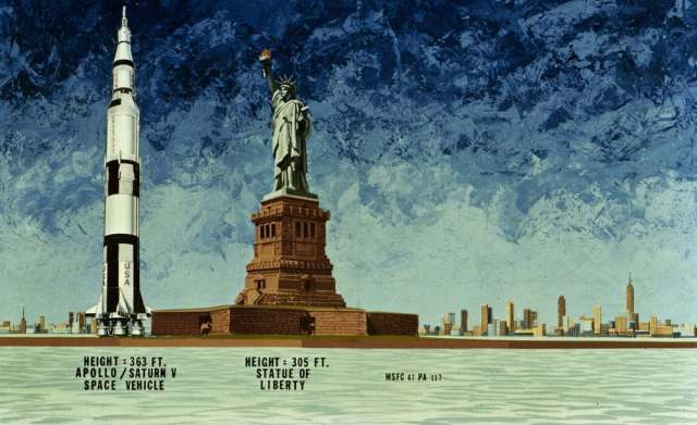 I found the following image of Saturn V compared in size with the Statue of Liberty. The five bell shaped Rocketdyne F1 engines generating millions of pounds of thrust can be seen at the bottom of the rocket (only 3 are visible, 2 are behind). Courtesy NASA.