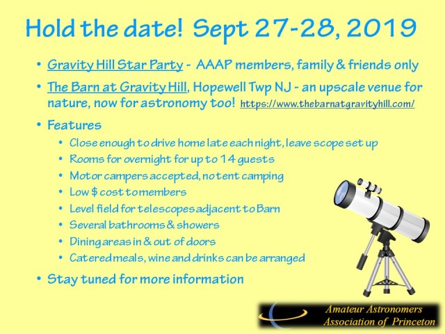 Hold the Date: Sept 27-28 Gravity Hill Star Party. Plans are being developed for a AAAP member star party, a new twist on the StarQuest theme of years past – stay tuned for more information later this summer.