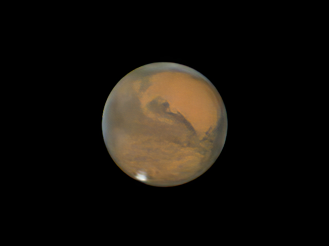 Bob Vanderbei is a professor in the Department of Operations Research and Financial Engineering at Princeton University. He is an amazing astro-photographer and a club member. His photo of Mars below taken at 3:15 a.m. on October 6 makes you want to visit the planet and perhaps make a stop at the resort on its southern tip!