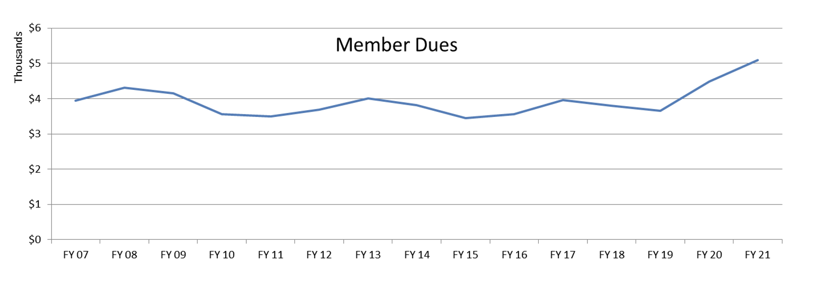 The AAAP had strong $1,546 surplus for the fiscal year, driven primarily by substantial increase in membership. The chart below shows member dues for the past 15 years: