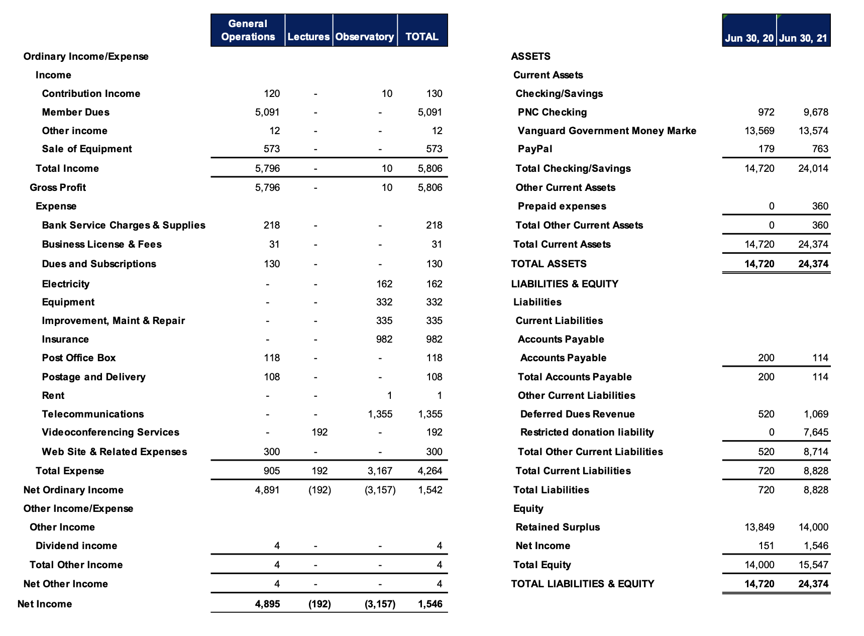 We received $7,645 in donations toward observatory repairs during FY 2021 but these are not included in the income statement. Rather, they show as a restricted donation liability on the balance sheet at June 30. Under the rules of accounting for restricted donations, they are taken into income at the time when they are used for their restricted purpose. Hopefully the observatory repairs will take place in FY 2022.