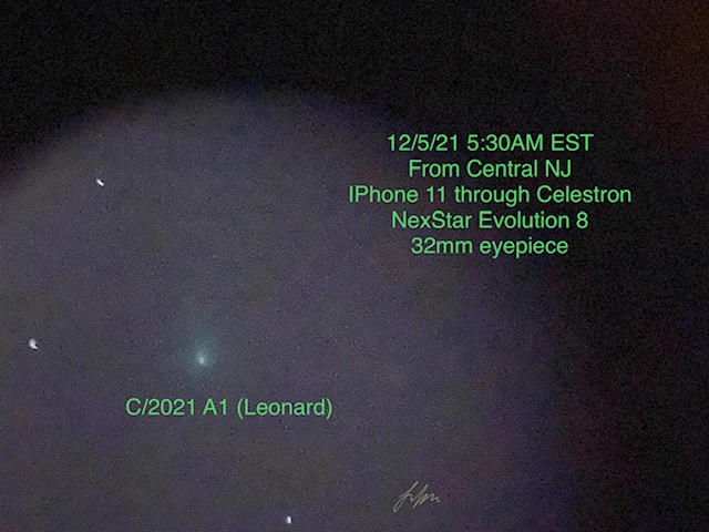 “The best laid plans of mice and men often go awry.” I feel like this sums up the last 2 years and Comet Leonard too! I’ve attempted to view the comet 9x and only had success twice. Here is my best digiscoped photo.
