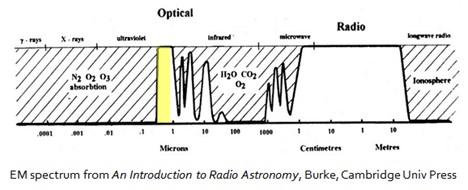 The development of sight in animals is a deep topic in evolutionary biology, and in astronomy the limit of eyesight has an obvious major role. As early as 1604 the Renaissance astronomer Johannes Kepler recognized this. His treatise Astronomiae Pars Optica, explores the properties of light and in line drawings the structures of the eye of several animal species are depicted. Two main reasons can be deduced for the limited spectral range of our eyes. Firstly, the earth’s atmosphere absorbs most of the radiation outside this range (Figure above, cross-hatched areas).