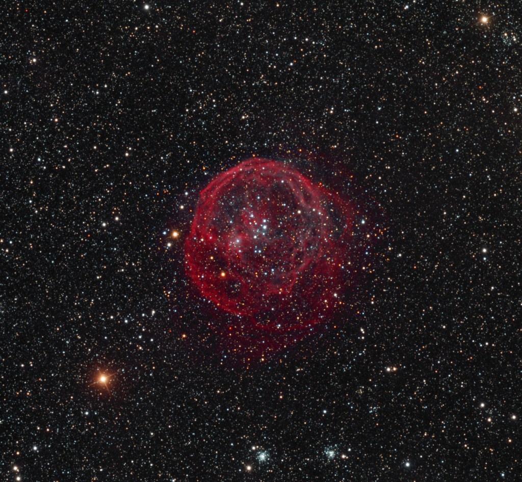 Henize 70 in the Large Magellanic Cloud from a 24” telescope in Chile. Turbulent clouds of interstellar gas and dust surrounding high mass stars form the nebula known as Henize 70 in the southern constellation Dorado. Henize 70 is an expanding superbubble about 300 light-years in diameter. Astrophoto by RA Parker.