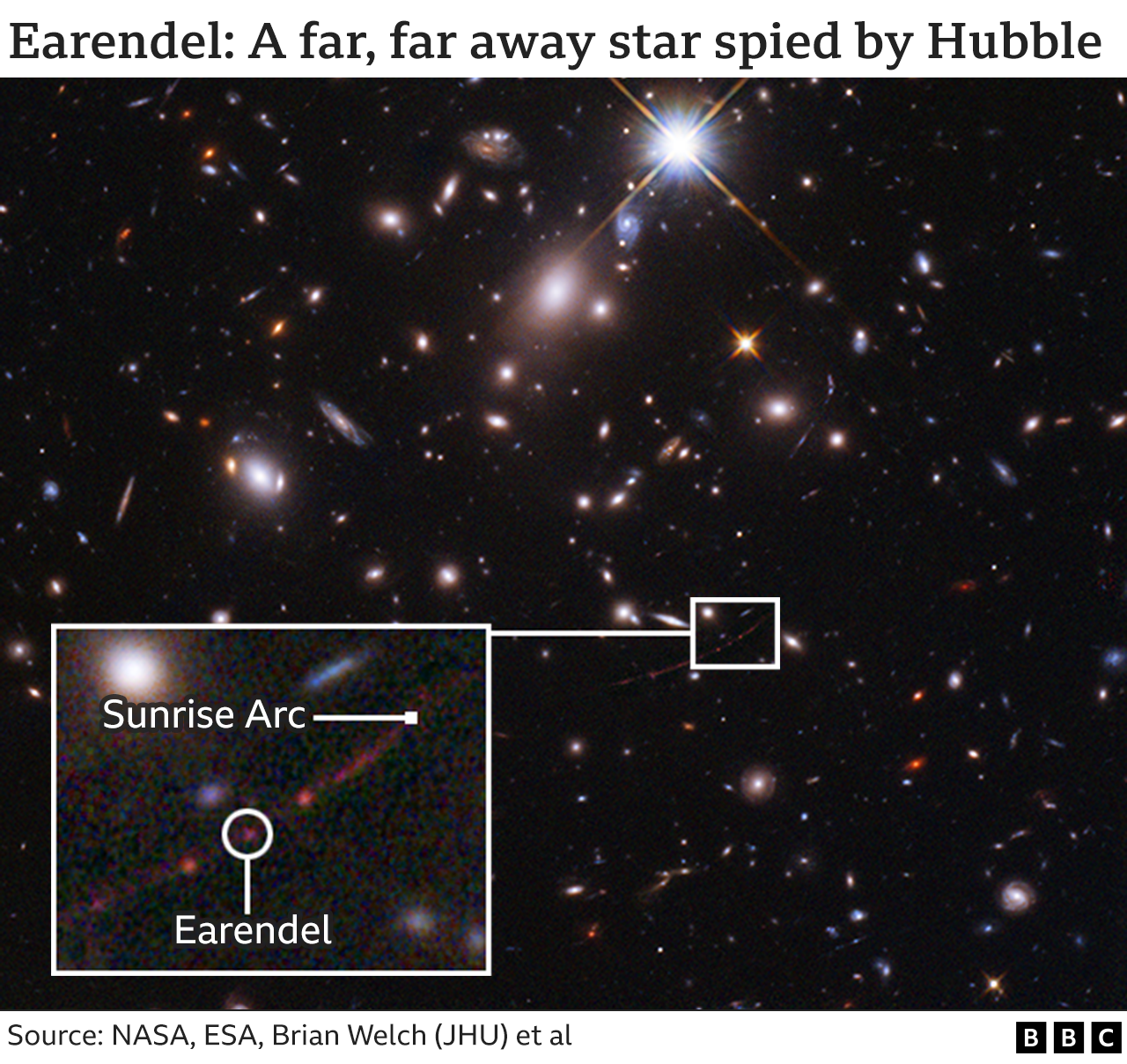 Hubble: ‘Single star’ detected at record-breaking distance They’ve nicknamed it “Earendel” and it’s the most distant, single star yet imaged by a telescope. The light from this object has taken 12.9 billion years to reach us. It’s at the sort of distance that telescopes normally would only be able to resolve galaxies containing millions of stars…more