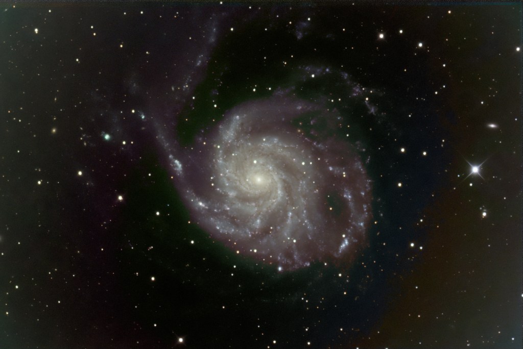 Don’t Miss It – the Best Season for Galaxies Is Spring. Many dozens of galaxies are visible this month in small telescopes from right here in New Jersey, and even more if you’re doing astro video/photography with your scope. The constellations Virgo, Coma Berenices, Canes Venatici, and Ursa Major are chock full of galaxies, and these remain well overhead in good observing position after twilight all through May. A fine example is Messier 101 which I was fortunate to photograph last week (below).