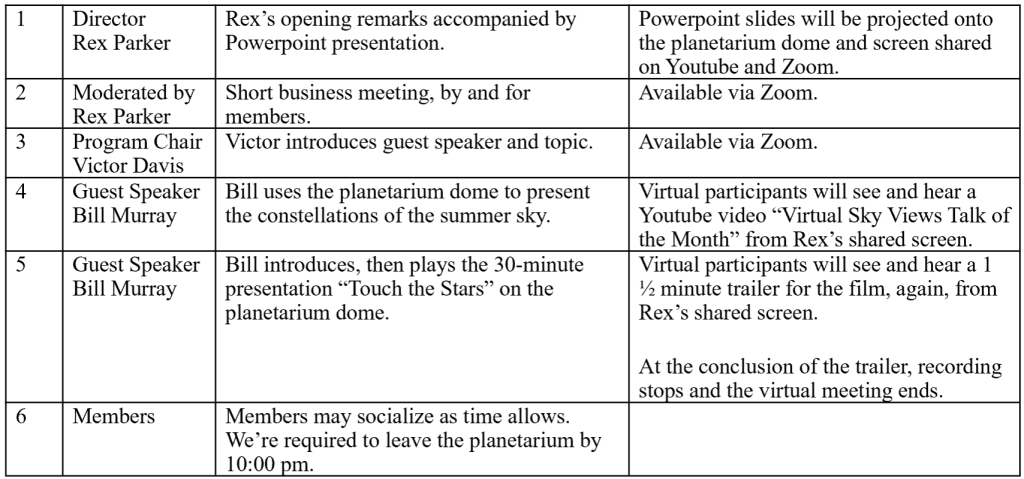 Unlike recent Zoom-only meetings, there will be no informal online chatting before the meeting starts promptly at 7:30 pm. In-person attendees will have the opportunity to socialize outside the planetarium building before the meeting starts. AAAP cannot access the planetarium prior to 7:00 pm, and Rex Parker, Bill Murray, and Dave Skitt will be setting up local and webcasting gear before the meeting begins.