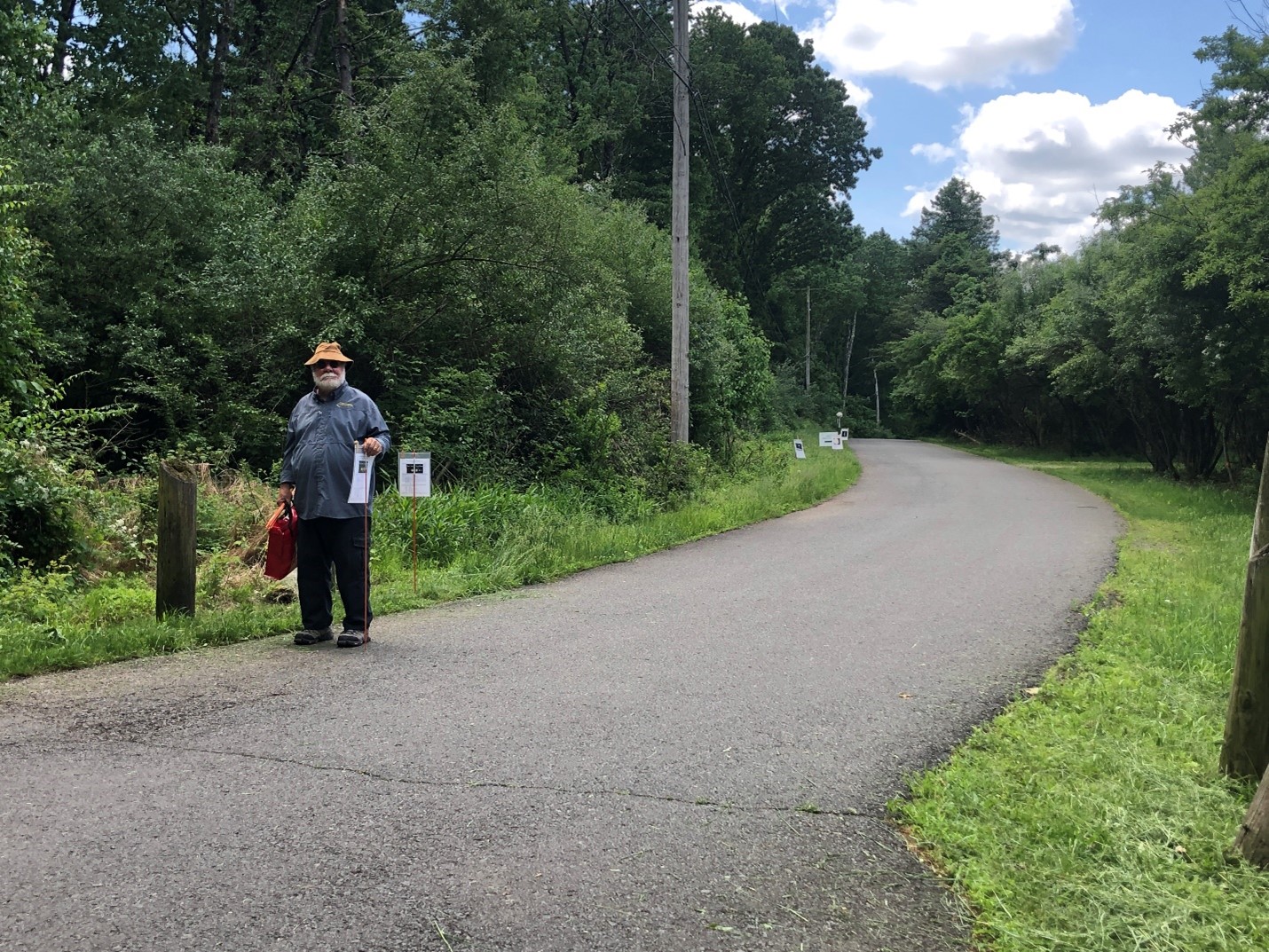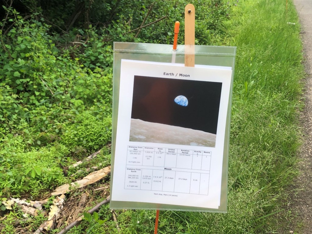 Setup for the 1 pm event began with Victor Davis placing a billboard at the park’s main entrance. He quickly moved to set up his scope and binoculars on a parallelogram mount. Victor then paced (plodded?) out a scale model of the solar system along the road to the observatory. Some thought he had gotten lost in space when he didn’t return after dropping Neptune in its way-out orbit. We all were relieved when he did reappear to attend to his equipment. Who else would keep his filtered binoculars on track with the Sun?