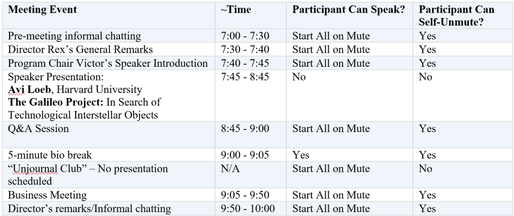 For the Q&A session, you may ask your question using Zoom’s chat feature or you may unmute yourself and ask your question directly to the speaker. To address background noise issues, we are going to follow the rules in the table below regarding audio. If you are not speaking, please remember to mute yourself. You are encouraged, but not required, to turn your video on.