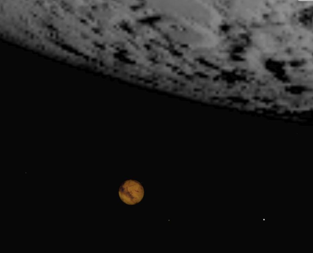 3. The two will be very, very close – about 11 PM the Moon will skim 1′ (about 5 Mars diameters) above Mars.