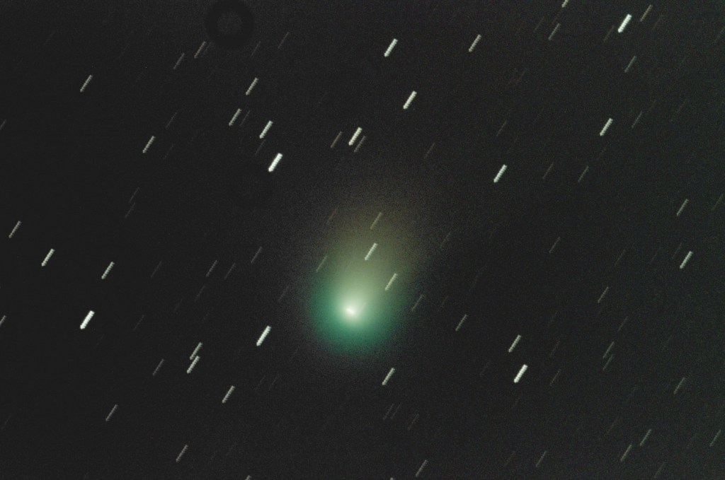 The green color in a comet’s core but not tail is an intriguing puzzle only recently solved. It is not the same photochemistry as other astrophysical processes, for example the blue-green fluorescence emission from doubly-ionized oxygen (OII) in planetary nebulae. The nucleus of a comet is an agglomeration of rock, dust, and frozen gases. As it gets closer to the sun and larger in our skies, heat increases and causes sublimation of gases to form a nebulous envelope around the nucleus, the coma. The tail is an extension of the coma’s molecules drawn out by the solar wind. Yet the green around the nucleus disappears in the tail which instead displays a distinct reddish brown color.