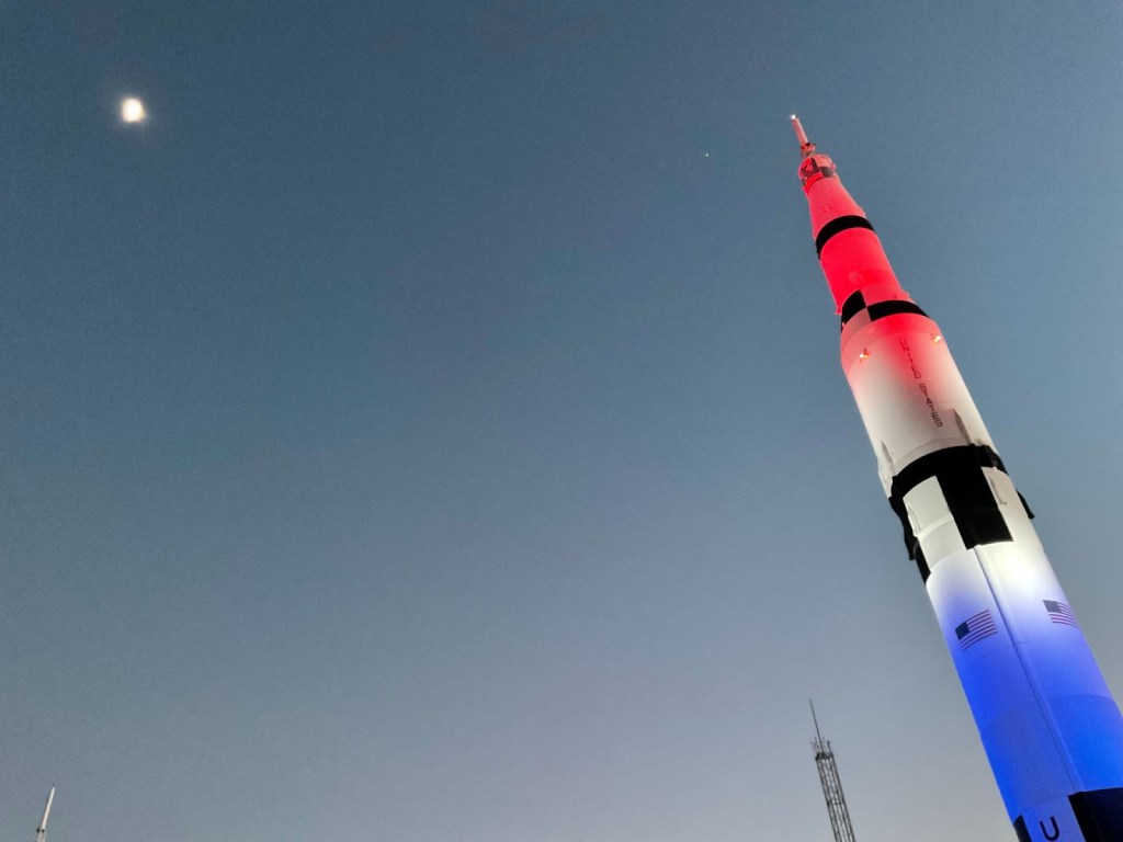 The picture below is of the same Saturn V rocket lit up as it was getting dark. The dimmer spot of light slightly to the left of the upper tip of the rocket is the planet Saturn !. The main building has a cross section of the Saturn V laid end to end horizontally. And each section explained in detail.