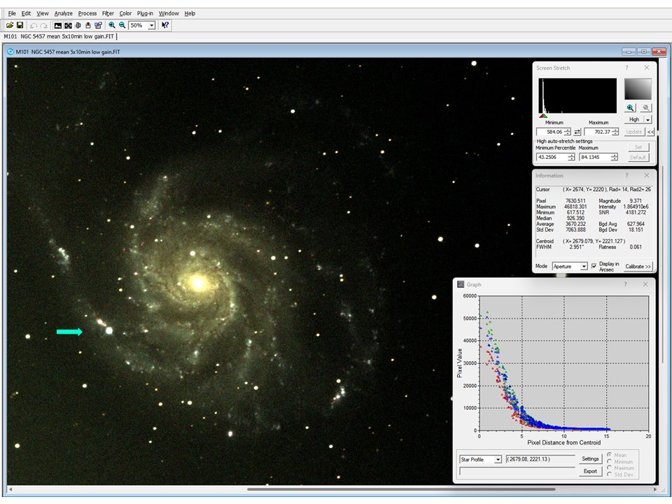 The spiral galaxy Messier 101 with the supernova SN 2023ixf indicated by the cyan arrow on the left. The graph shows the light profile of the SN recorded by the CMOS sensor R,G,B Bayer matrix filters. Image is the mean of 5x10min exp. with a ZWO ASI2400MC camera and 12.5” f/6.7 reflector. Software is Diffraction Limited’s Maxim DL v6, image by RA Parker.