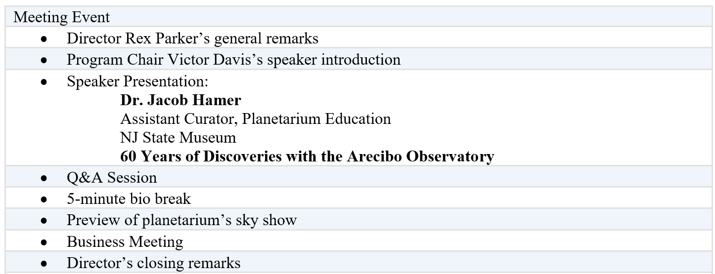 Dr. Hamer will talk of the legacy of the Arecibo radio telescope and present a preview of the planetarium’s new sky show projected onto the dome by its recently refurbished projection equipment. This is an IN-PERSON ONLY event; you must be present in the planetarium to experience the program and participate in the meeting’s agenda. There will be no option to zoom at this meeting, nor will there be a recorded version to play back later.