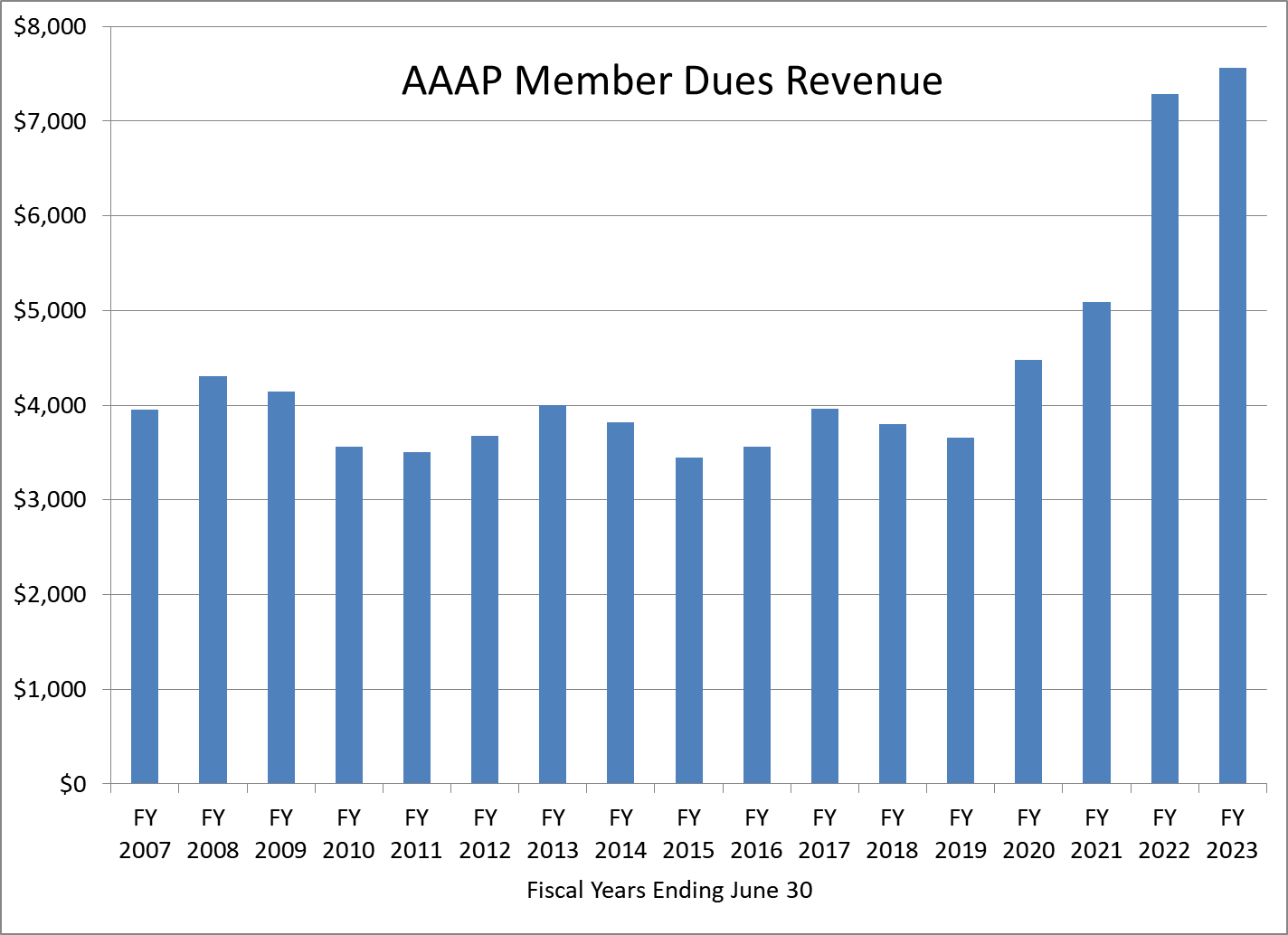 The AAAP had a $2,481 surplus for the fiscal year, similar to last year’s. The chart below shows member dues for the past 16 years: