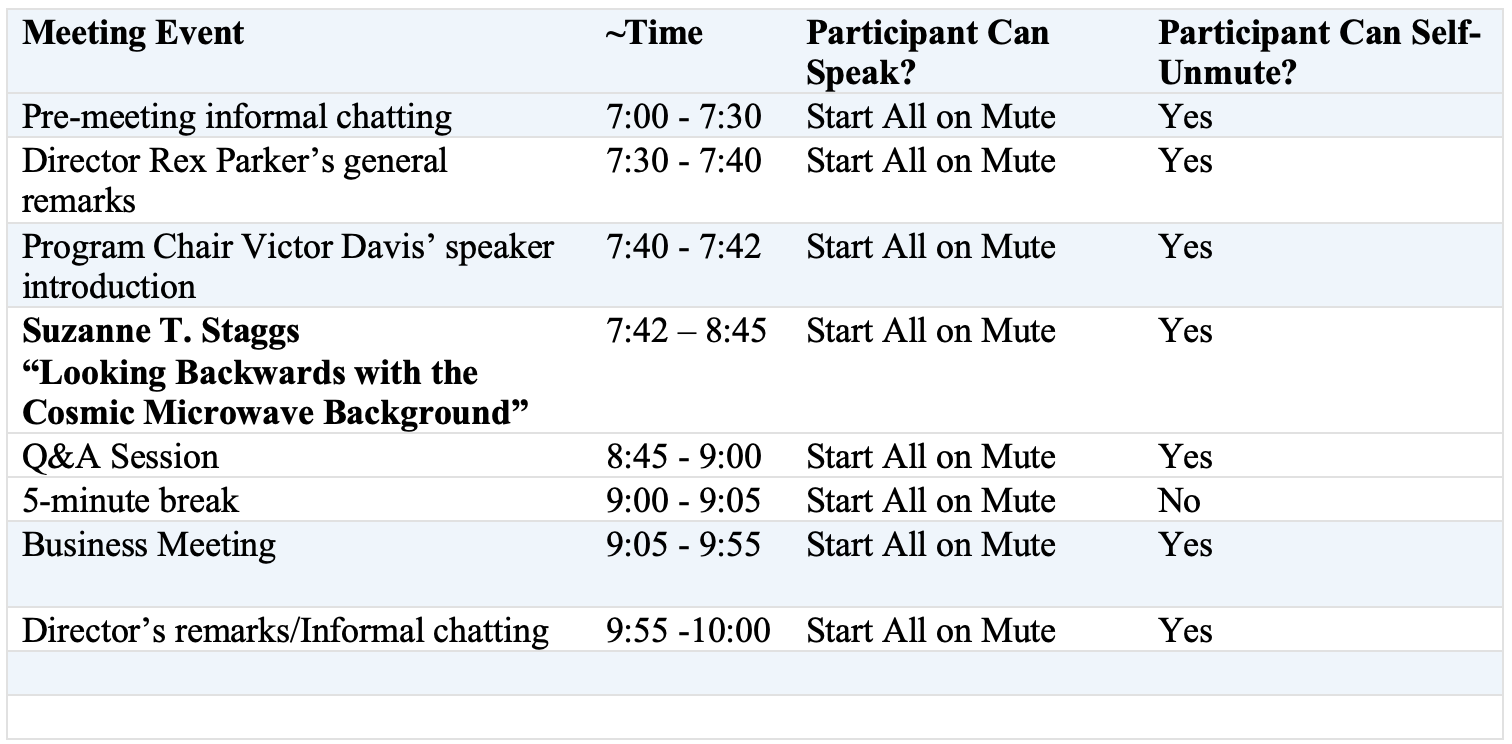 Topic: AAAP-September 2203 Meeting-Prof. Suzanne T. Staggs, Princeton University, “Looking Backwards with the Cosmic Microwave Background.”