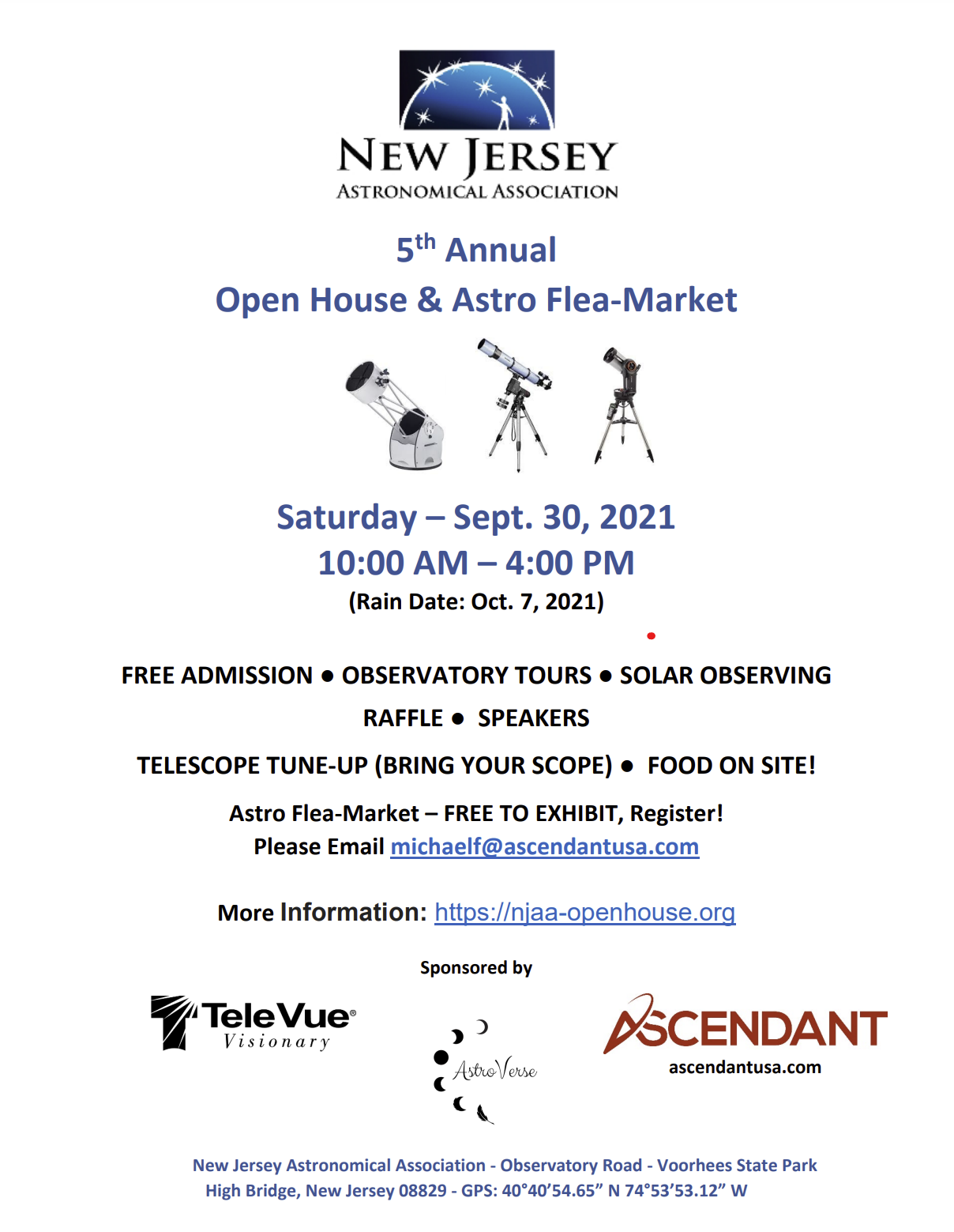 The New Jersey Astronomical Association’s 5th Annual Open House and Astro Flea-Market is on Sept. 30, 2023 (10:00 AM-4:00 PM EST). Rain Date is Oct. 7, 2023.