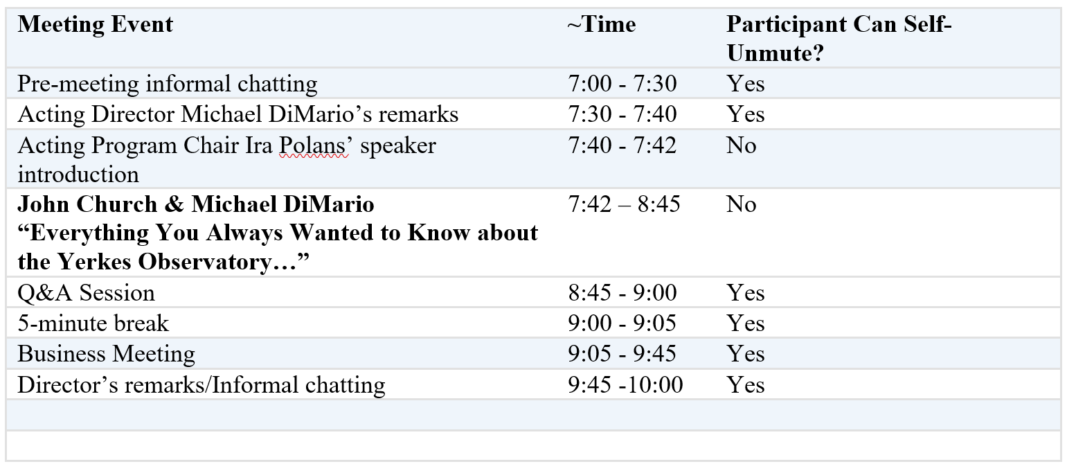 You may choose to attend the meeting in person or participate via Zoom or YouTube as we’ve been doing for the past few years. (See How to Participate below for details). Due to security concerns, if you log in before the host has set up internet connectivity in Peyton Hall, you may need to wait in the Waiting Room for a few minutes until the host is prepared to admit you into the meeting. You’ll need to unmute yourself to make comments or ask questions. It’s polite, though not required, for you to enable your camera so other participants can see you.