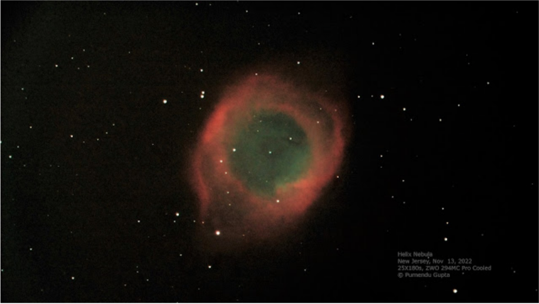 About 12,000 years ago, the progenitor star of the Helix nebula started to run out of its hydrogen fuel. The star cooled some and lost some of its ability to hold itself up against gravity. The core shrank, and the outer layers slipped away from its grip into space cooling and expanding into a red giant. This was the end of the “middle class sun” phase of life of the star. Any planets that may have existed in that solar system experienced the last sunset as the red giant engulfed the inner planets.