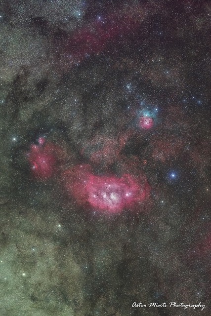 Lagoon Nebula (in the middle of the image) or known as M8 or NGC 6523 is an emission nebula in the constellation Sagittarius. The Lagoon Nebula is estimated to be between 4,000–6,000 ly away from Earth and its dimensions are about 100 ly by 50 ly.