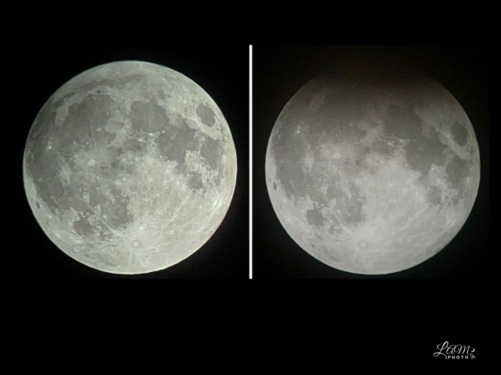Left: 9:31 PM ET partial penumbra eclipsed moon