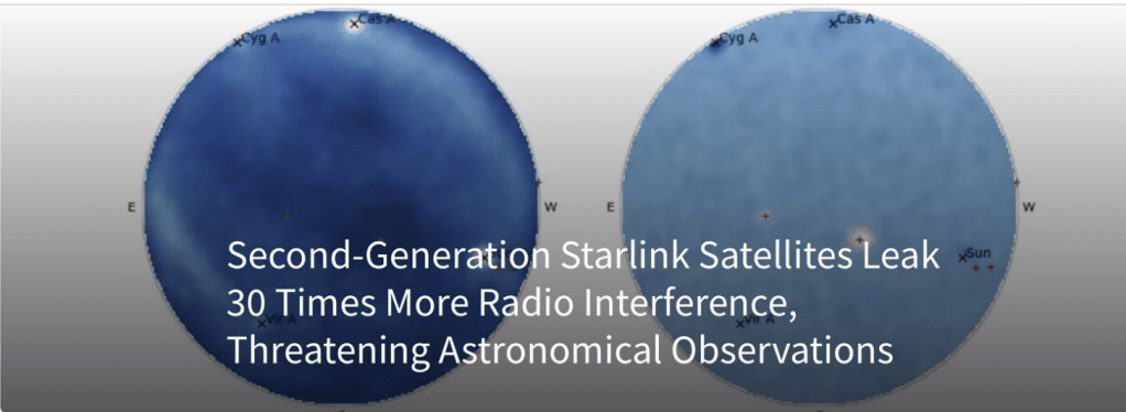Observations with the LOFAR (Low Frequency Array) radio telescope last year showed that first generation Starlink satellites emit unintended radio waves that can hinder astronomical observations. New observations with the LOFAR radio telescope, the biggest radio telescope on Earth observing at low frequencies, have shown that the second generation ’V2-mini’ Starlink satellites emit up to 32 times brighter unintended radio waves than satellites from the previous generation, potentially blinding radio telescopes and crippling vital research of the Universe.