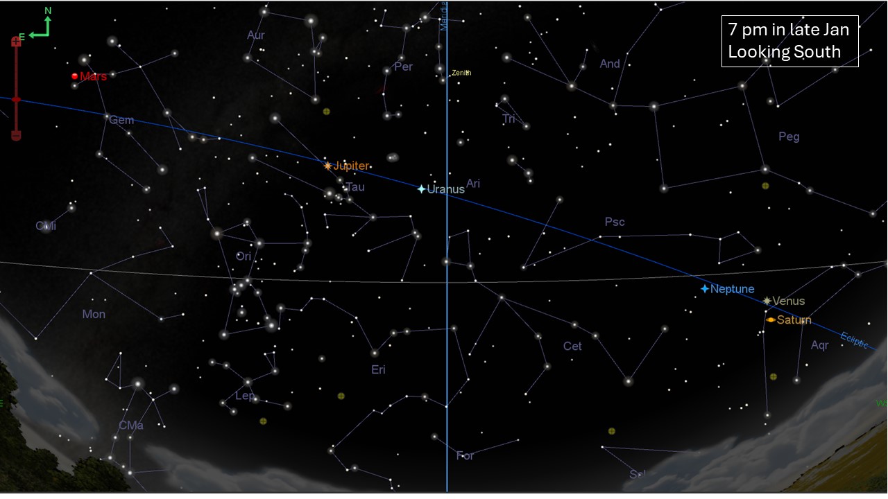 Sky chart for Princeton area in late January 2025 looking south. Six of the planets can be seen at this time, a rare arrangement. The curved blue line is the ecliptic; the vertical blue line is the prime meridian. Chart prepared using TheSkyX program from Software Bisque.