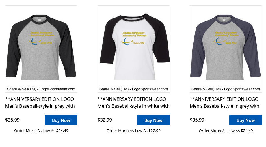 This year, we have added men’s and women’s baseball-style shirts and some tank tops to complement our existing array of t-shirts, polos, and hats. Due to the limitations of the hosting website, we can only list a certain number of items on the store, but there are many more colors available for every apparel item you see. So if you want a different color (or you still want a winter item that you forgot to buy), just email me at merchandise@princetonastronomy.org, and I will do my best to get you what you want.
