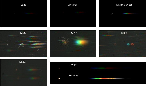 How to Really See the Colors in the Stars. The sense of color in the stars by naked eye is subjective and often subtle. But color is an important property that relates to fundamental physics of the stars. In the scheme developed by astronomy, the letter sequence “OBAFGKM”, designates the stellar types from bluest/hottest to reddest/coolest. Mostly due to the expense and complexity of spectroscopes applied to telescopes, it’s been difficult and a bit arcane to get into amateur astro-spectroscopy. However, at nominal cost a low resolution yet modestly effective diffraction grating (the component that disperses light) with standard 1.25” filter threads is available. This approach works with eyepieces, or better with astro-cameras in a variation on the standard telescope imaging setup. Below are some initial results from my equipment in NJ in early July, using the “Star Analyzer 100” diffraction grating — a 100 lines/mm transmission grating. I attached this in place of filter on my ZWO ASI-071MC camera and 12.5” reflector telescope, with adapter to give about 80mm spacing from grating to sensor (spacing is critical to disperse the spectrum to fit the width of the imaging sensor).