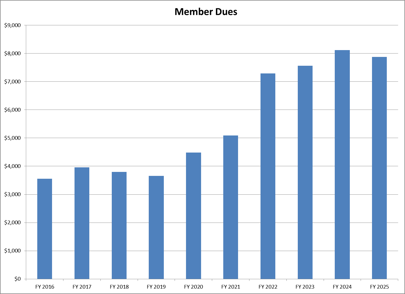 The AAAP had a $4,813 surplus for the fiscal year. The chart below shows member dues for the past 10 years: