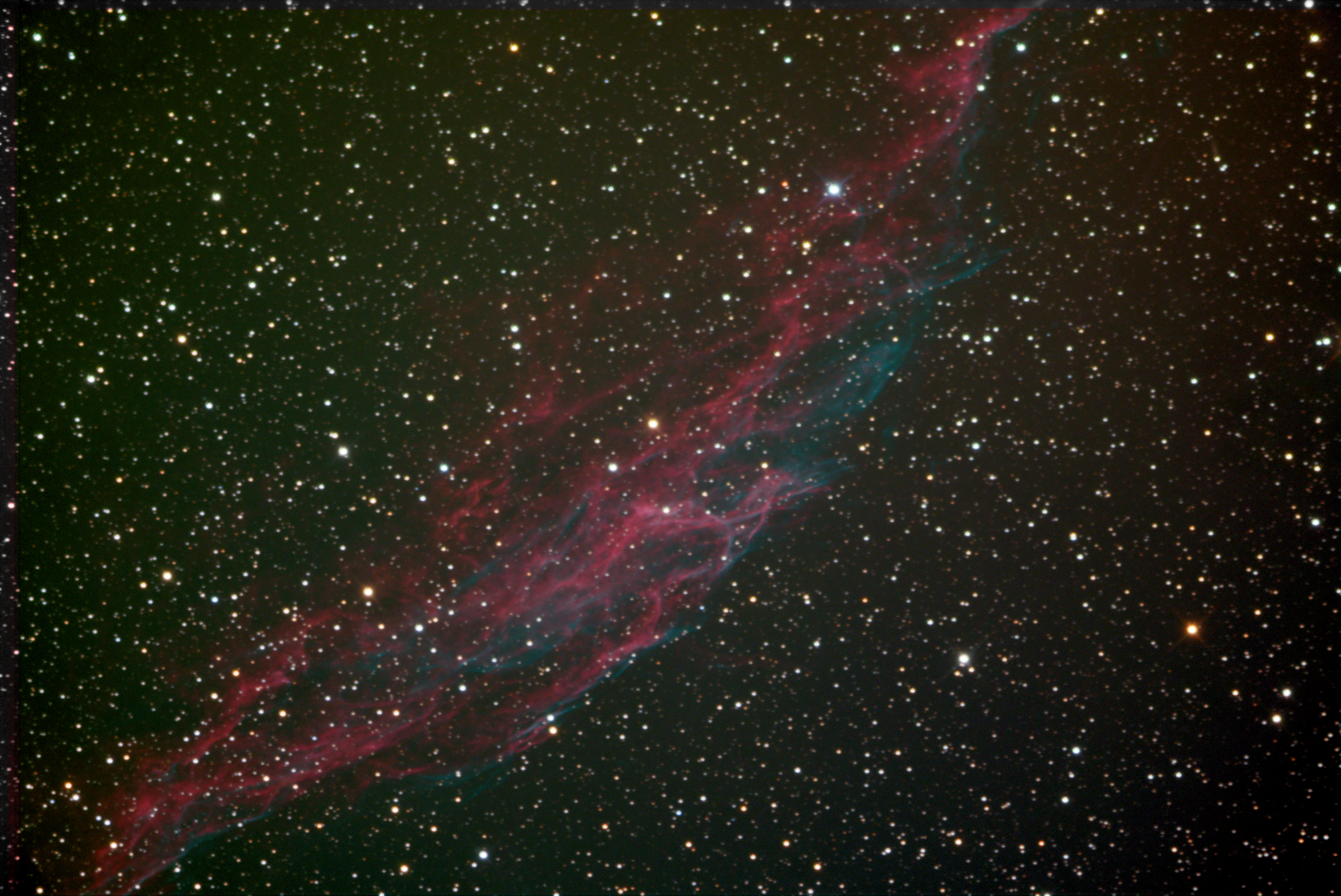 Mid-summer supernova remnant The Cirrus Nebula in Cygnus, NGC 6992, is high overhead after sunset in August and makes a great target for EAA and astrophotography. It is part of a large circular structure expanding in space like a shock wave from the nova event 15000 years ago. During a few clear nights recently, I was able to obtain some decent data on this colorful though faint supernova sequel. The image below was processed from about 6 hours of data, with 10 min subs using a 12.5” scope and ASI2600MM camera with filters. Astrophoto by RAParker from NJ